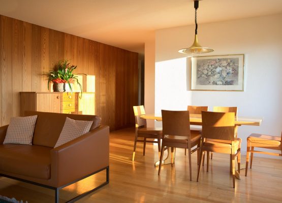 1 sitting room with twin beds or 1 queen-bed, 1 bath/WC, kitchenette with a table for 2 pers., TV and south facing balcony with a view of the Alps.