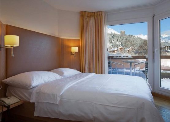 lits jumeaux ou grand-lit, bain ou douche/WC et balcon sud avec vue imprenable sur les Alpes